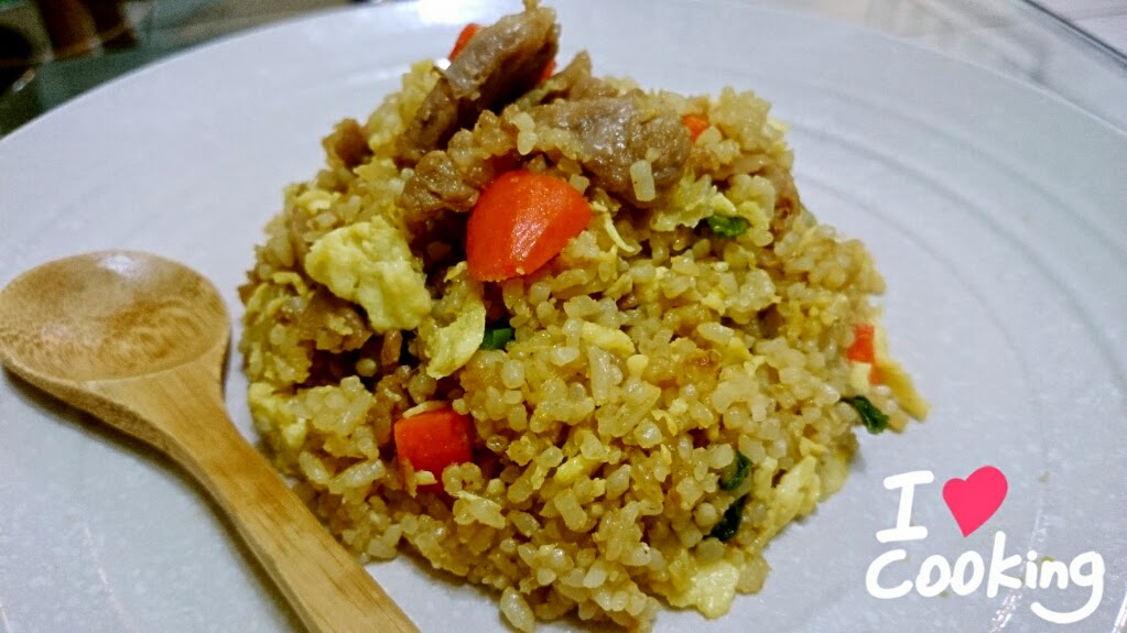 2.將飯粒上色時要炒的很均勻是重點,咖哩塊比較濕且成塊狀,所以要炒比較久,不時離鍋炒避免鍋子溫度太高且要注意不要炒焦。